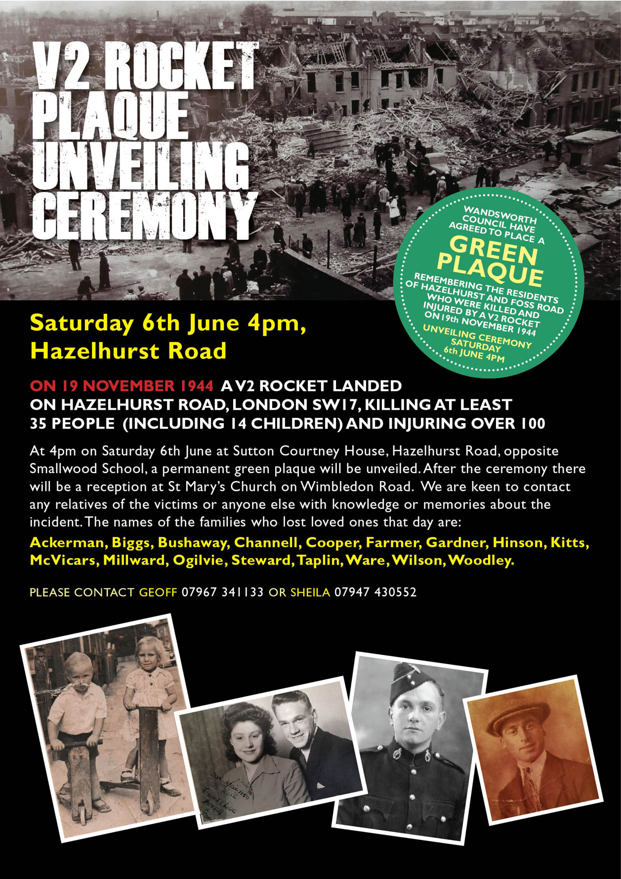 Inextricably linked with the story of the Summerstown182 is an event from a later war which struck a huge blow to this community on 19th November 1944. On that Sunday morning, a V2 rocket smashed into Hazelhurst Road, killing 35 people and injuring over a hundred. The seventieth anniversary of this in November 2014 was marked with a service in nearby St Mary’s Church and a ceremony at the location. Subsequently Wandsworth Borough Council agreed to place a green heritage plaque on the site and this was unveiled 0n 6th June 2015 at a very well-attended and moving event. Many of the victim’s relatives were present as well as at least a dozen people who were actually there that day when the bomb fell. Between these ceremonies, many individual stories and testimonies were gathered, primarily to form an archive of the incident. These memories have been painful and we are very grateful to everyone who has spoken to us. They are very precious and we are anxious that they should be permanently preserved in some kind of publication which in time we hope to produce. If you have any memories about what happened that day or know someone who can tell us something about it, please do get in touch.