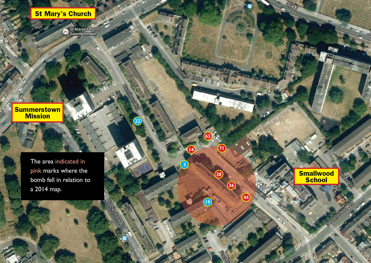 The names of the 35 people living in Hazelhurst Road who were killed in the attack were: No22 Eileen McVicars (age 19, lived at 13), No18 John Arthur Harold Taplin (8months), No24 Alice Steward (72), Thomas Steward (74), Thomas James Steward (34), William Joseph Millward (51), No26 Josephine Doris Woodley (14), No28 Minnie Matilda Ware (59), Eileen Dorothy Ware (12), No30 Elizabeth Channell (25), John James Channell (27), John James Channell (4), Harry Ogilvie (92), Benjamin Leonard Farmer (37), Thirza Dorothy Farmer (34), Leonard Farmer (11), Dennis Farmer (7), Kenneth Farmer (4) No32 Florence Anne Gardner (38), Ernest George Gardner (32), Dorothy Gardner (32), John William Gardner (8), Ernest David Gardner (3), No34 Terence Bushaway (6months), Cissie Alice Susan Bushaway (42), No36 Florence Betty Ackerman (13), William Joseph Ackerman (10), Florence Nellie Biggs (26), Christopher Kitts (56), Douglas Kitts (24), No38 Winifred Hinson (37), Raymond Arthur Hinson (14), Robert William Hinson (5), Emily Florence Cooper (30), No71 Jane Elizabeth Wilson (66).