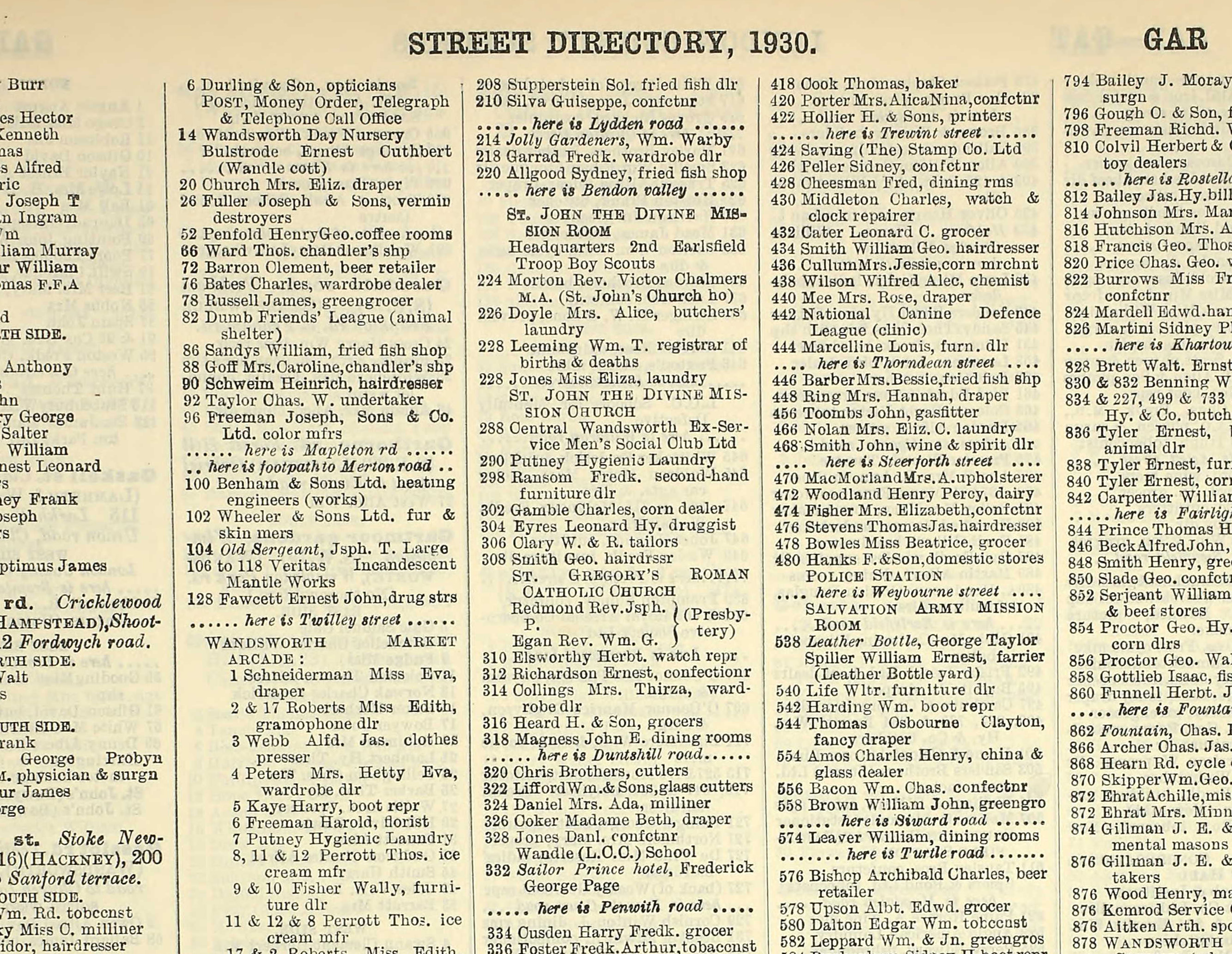 He was sandwiched between Hewlett’s newsagents and Miss Beatrice Bowles’ grocery store at 478. This must have been convenient for picking up snacks and reading material for punters waiting for a trim. On the corner, currently the much-loved Elena’s Cafe was Leslie Jobson’s dining room with the Woodland Dairy next door. A little further along, Mr Willows ran his ‘fried fish shop’, still going strong as the popular ‘Sea Horse’ – surely the best chippy on Garratt Lane. The chinese takeaway at 466 was Albert Foster’s sweet shop. The off-licence on the corner of Steerforth Street was still there with the superbly named ‘Canine Defence League Clinic’ a few doors further on.