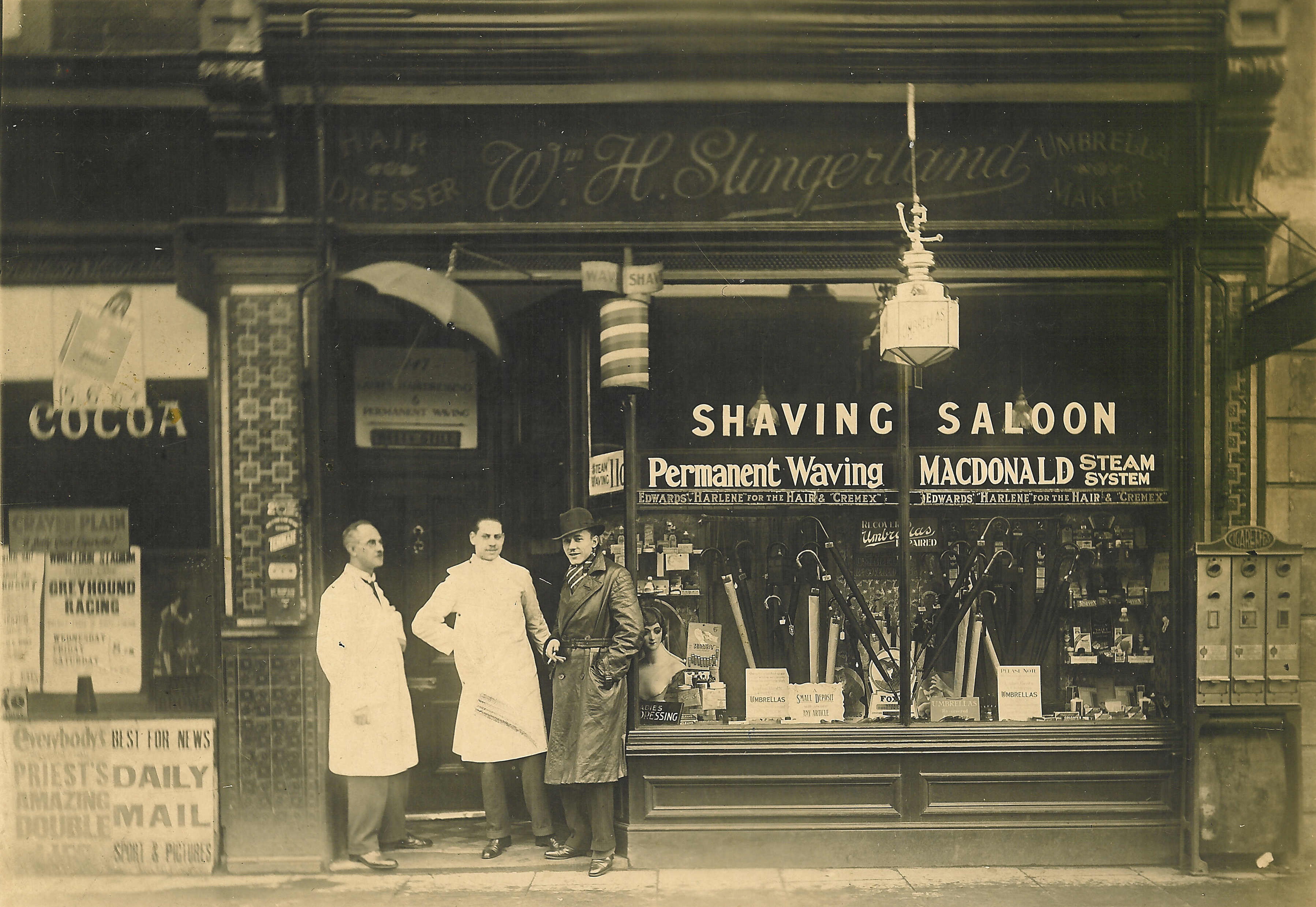 Down the road in Summerstown, another rival in the barber business was Albert Kirk at 715 and William Slingerland at 747 whose family have shared the lovely photo above. Their shop was next door to the Stadium Café, most recently a branch of Ladbrokes. Essentially this self-sufficent pre-supermarket era cluster of businesses meant that no one had to shop too far from home. Note the poster on the left advertising ‘greyhound racing’ at the recently-opened stadium. It was all there for them on this one sliver of mid-section Garratt Lane, though a bit further towards Earlsfield station were branches of David Greig, Victor Value and Boots. Times were changing though and in 1930, just a mile down the road Jack Cohen, whose family had a similar Whitechapel Jewish migrant back-story to Barney, was setting up his first market stall in the new Tooting Market. He was of course the founder of Tesco. Both First World War veterans, its fascinating to wonder if the two ever had a chat.