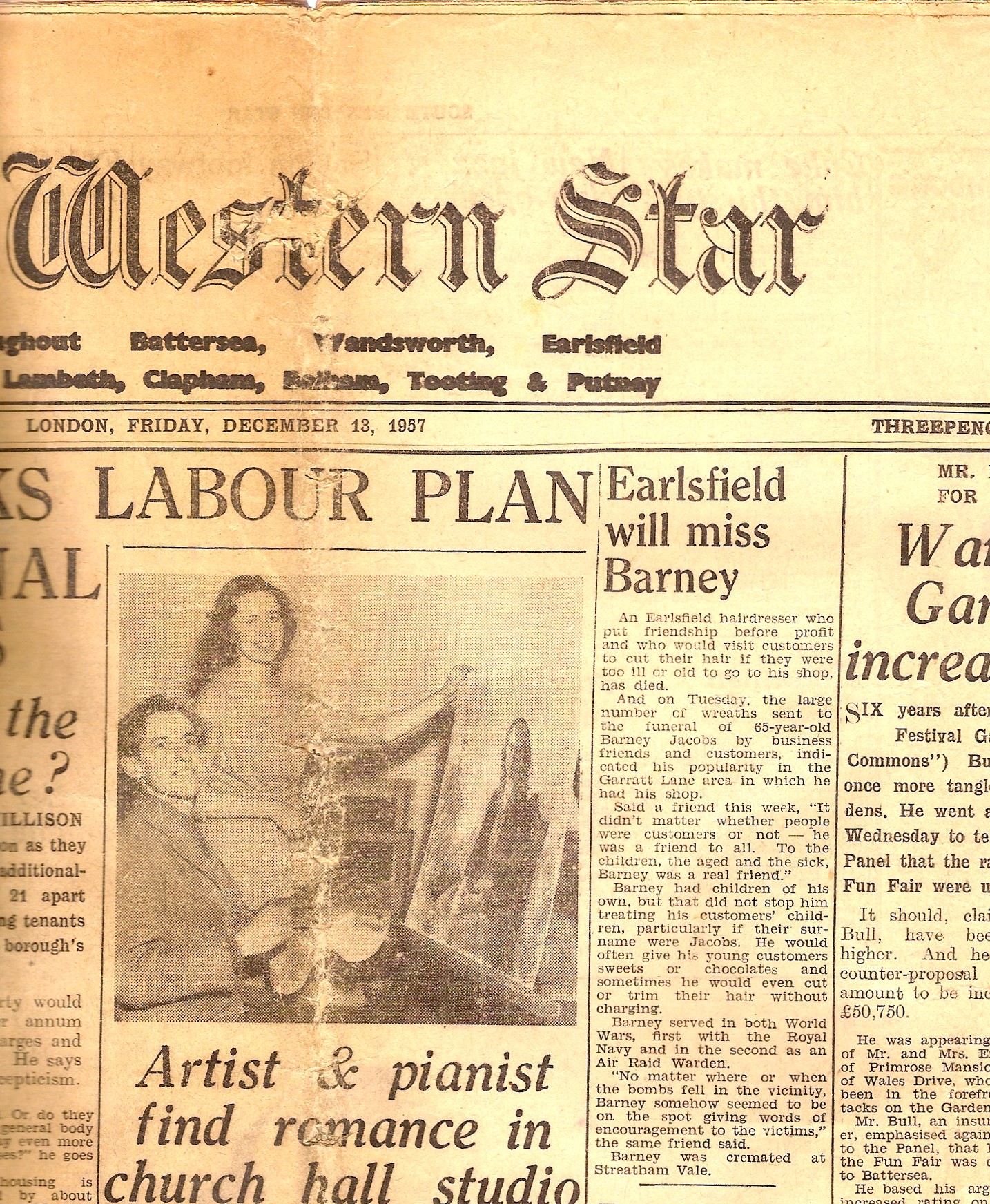 Take a walk down Garratt Lane and ask anyone of a certain age if they remember ‘Barney’s’ and a warm smile of recognition is sure to flitter across their face. Whether its the memory of that first hair-cut and being positioned across the arms of the barber’s chair on Barney’s plank, being presented with one of his lollipops or possibly having him give you a short back and sides with a cigarette dangling perilously close, his name lives on in Earlsfield and will do so for many more years when a historic blue plaque arises on the site of his premises later this year.